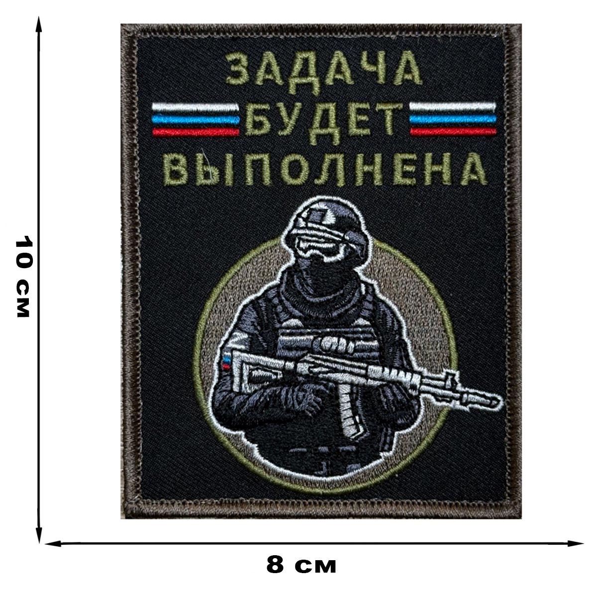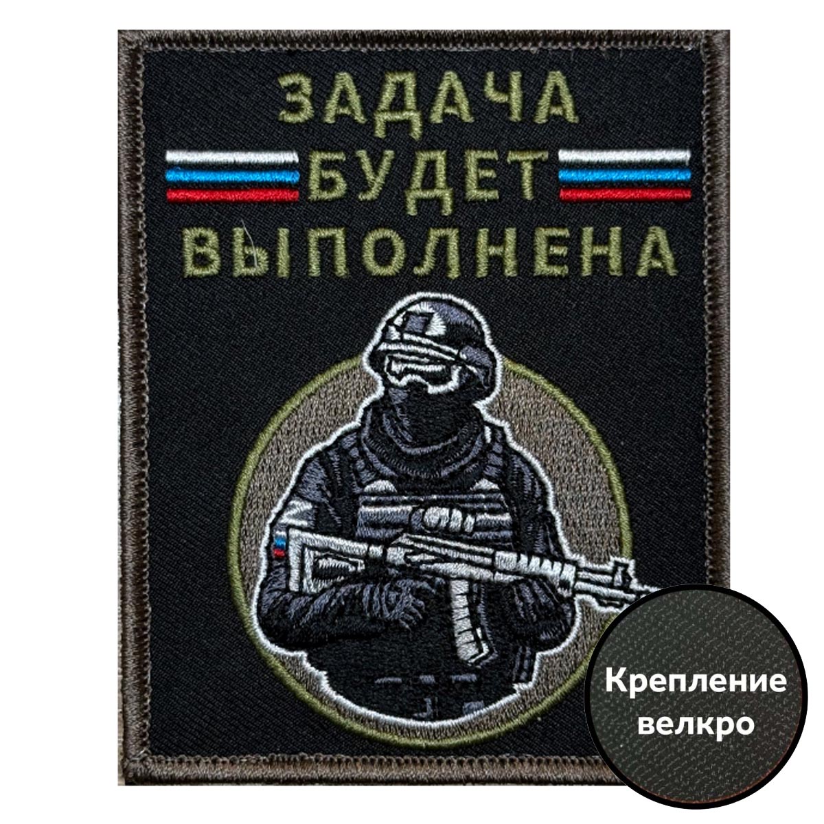 Шеврон "Задача будет выполнена" с бойцом (10х8см) оснащен удобной липучкой, которая надежно крепится на любой панели велкро, на снаряжении и экипировке бойца.