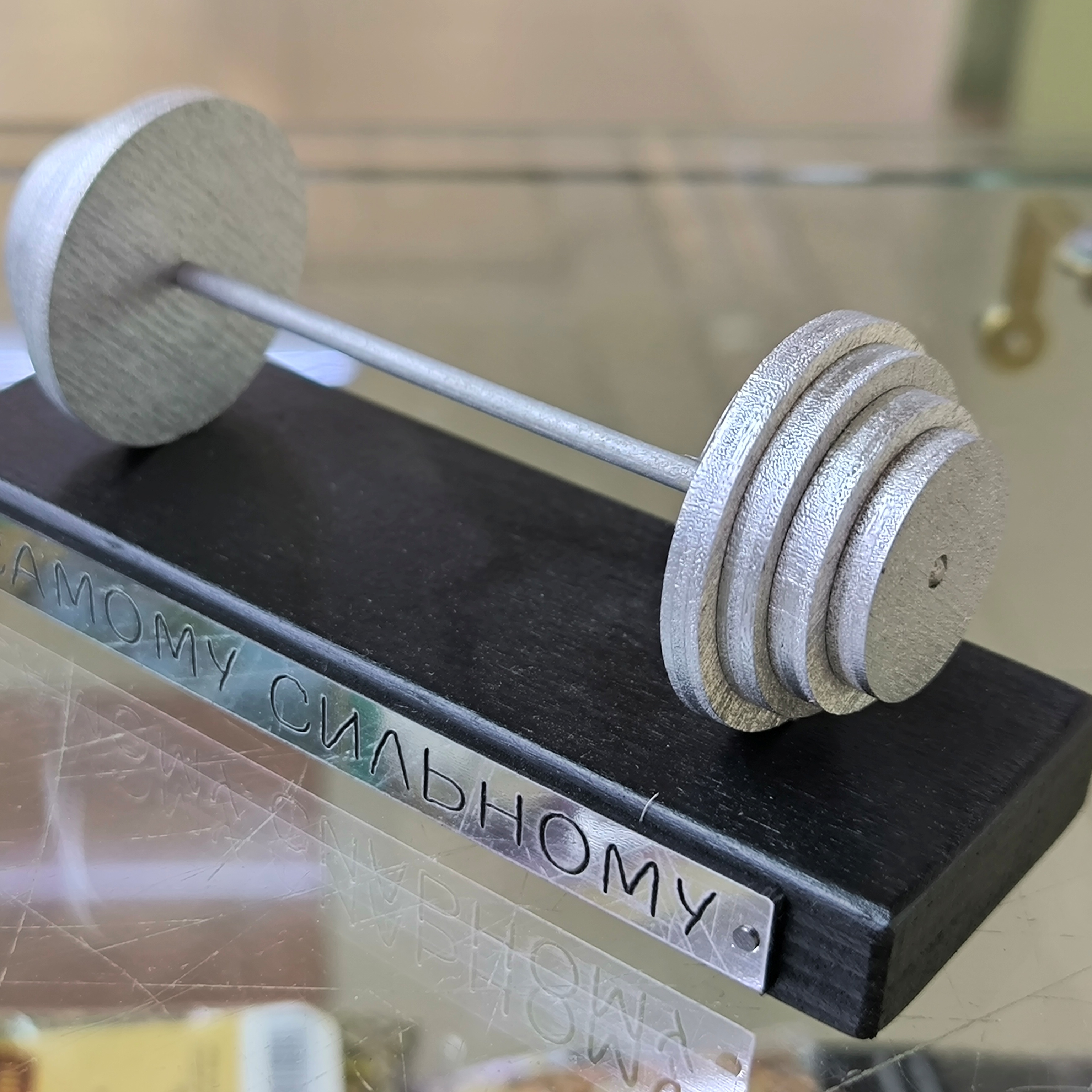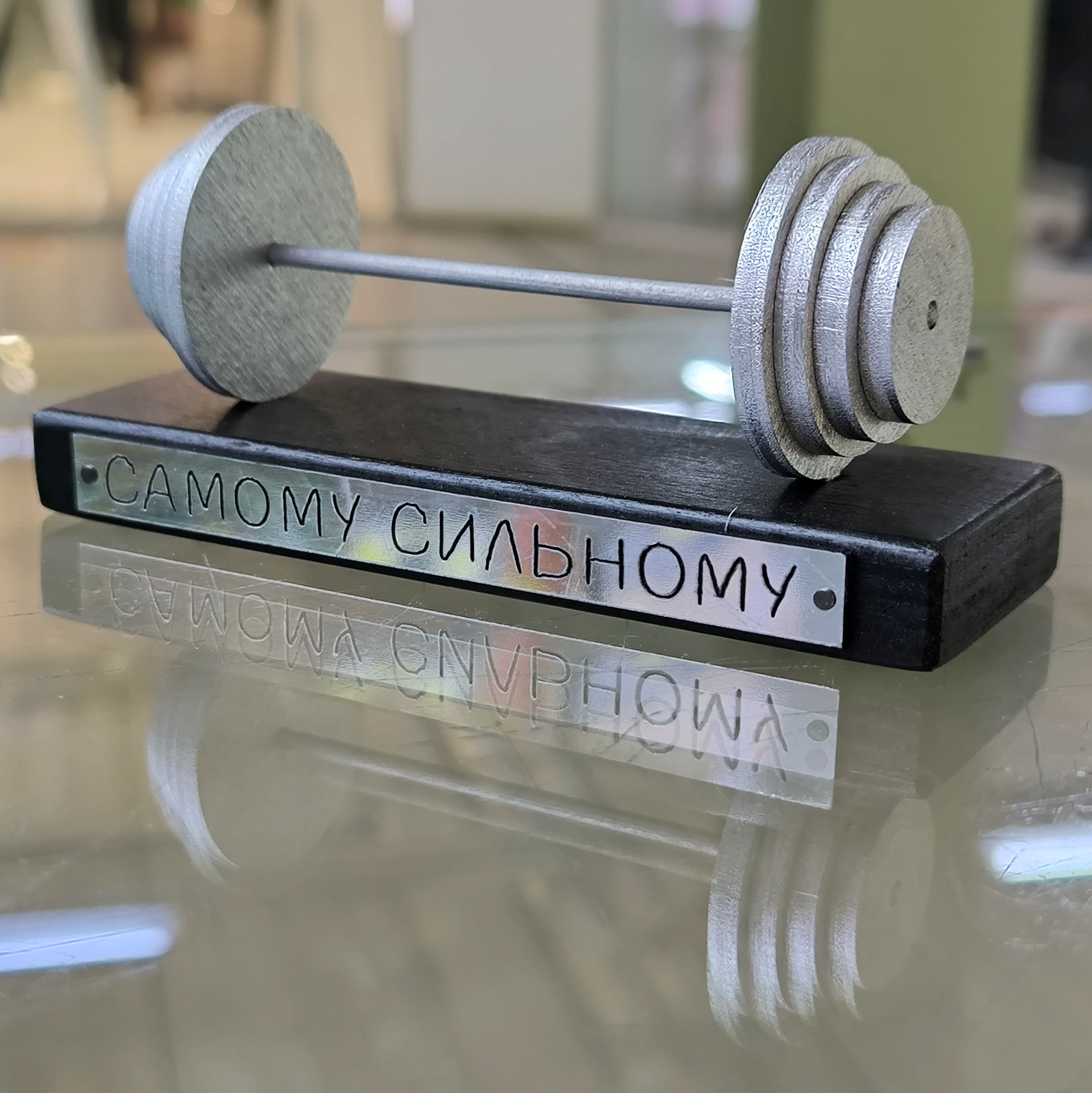 Сувенир награда "Самому сильному" в виде штанги на подставке станет ярким акцентом интерьера и подчеркнет мужество, силу и характер владельца. Уникальный дизайн и высокое качество изготовления превратят этот сувенир в предмет гордости настоящего мужчины.