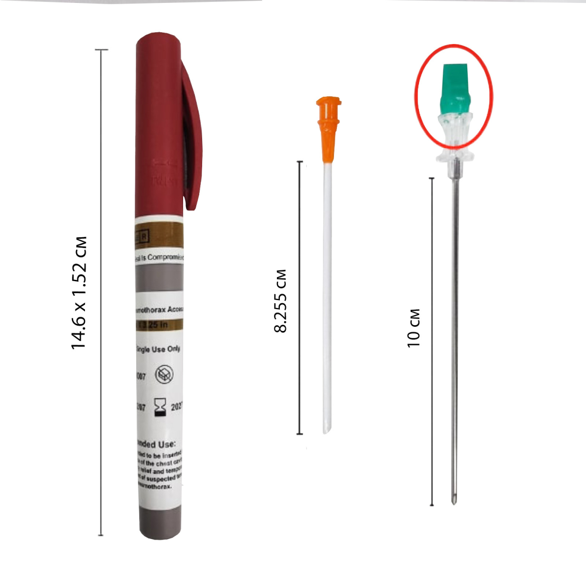 Обязательный элемент комплектования армейской индивидуальной аптечки. Игла оснащена защитным футляром. Благодаря соответствующей длине иглы и катетера, с их помощью можно проникнуть в плевральную полость даже у самых рослых и широкоплечих бойцов.