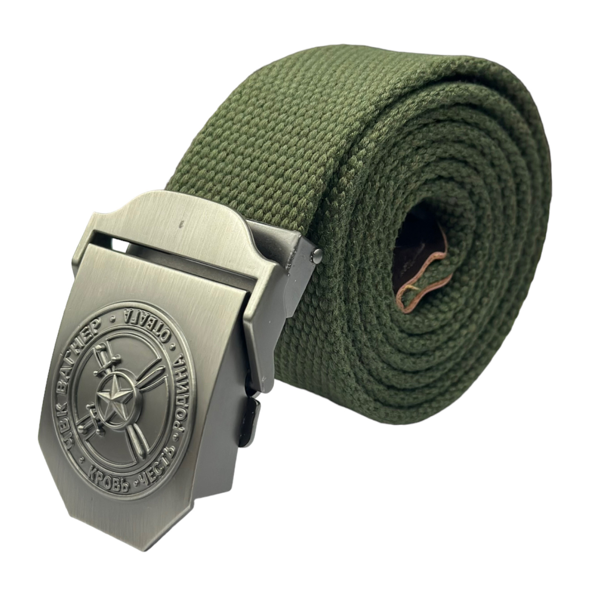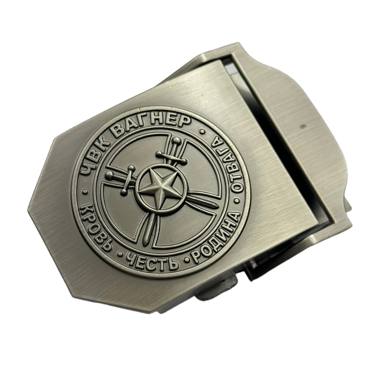 Пряжка декорирована объемной эмблемой ЧВК Вагнер с девизом "Кровь Честь Родина Отвага"