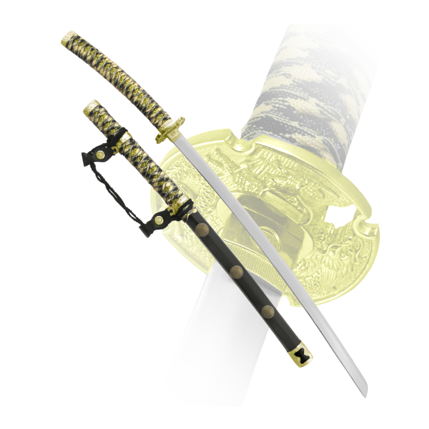 Изделие украшается латунными вставками, окрашенными под золото - эфес при этом выполнен из легкого и прочного сплава, благодаря которому модель характеризуется легким весом.