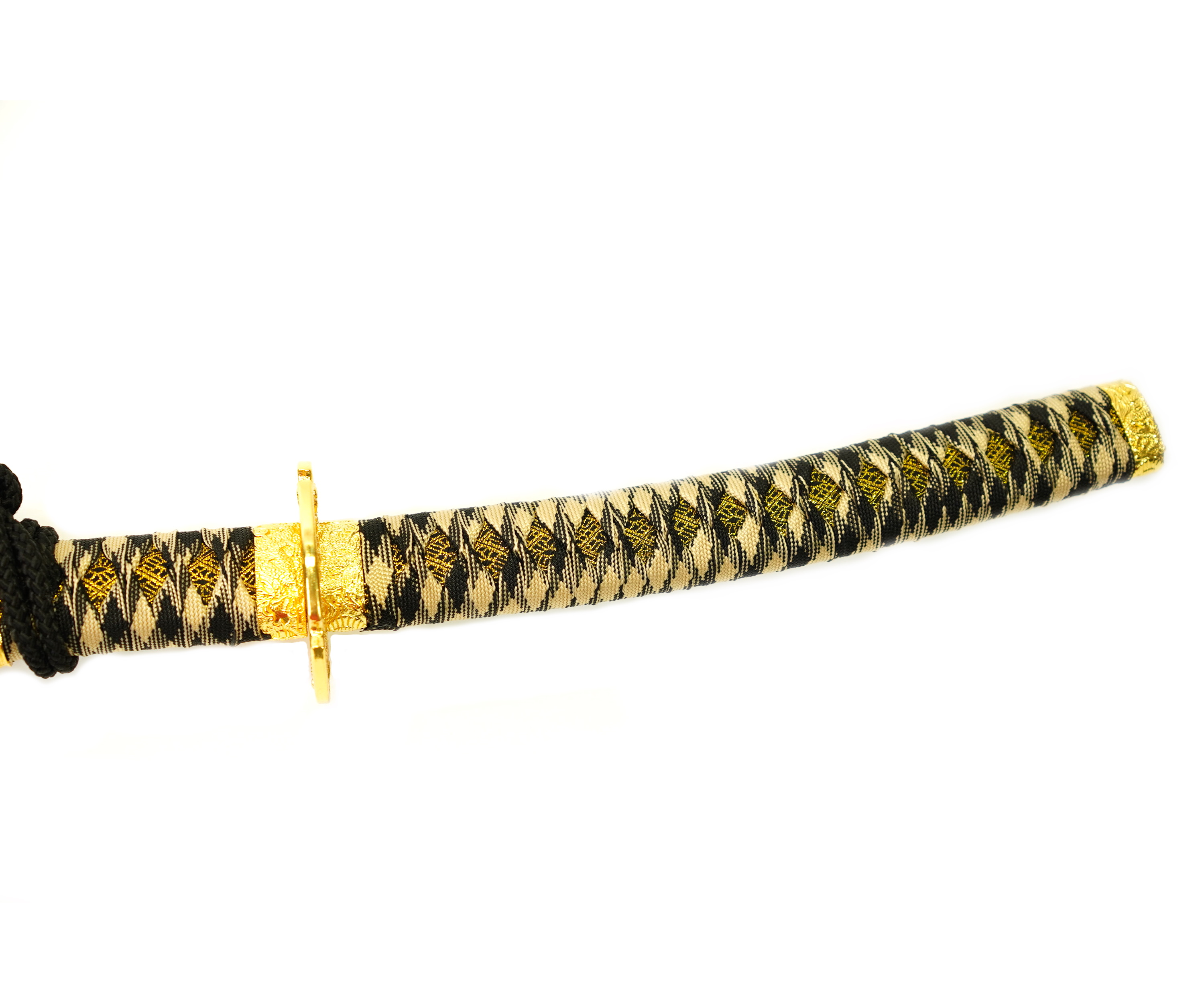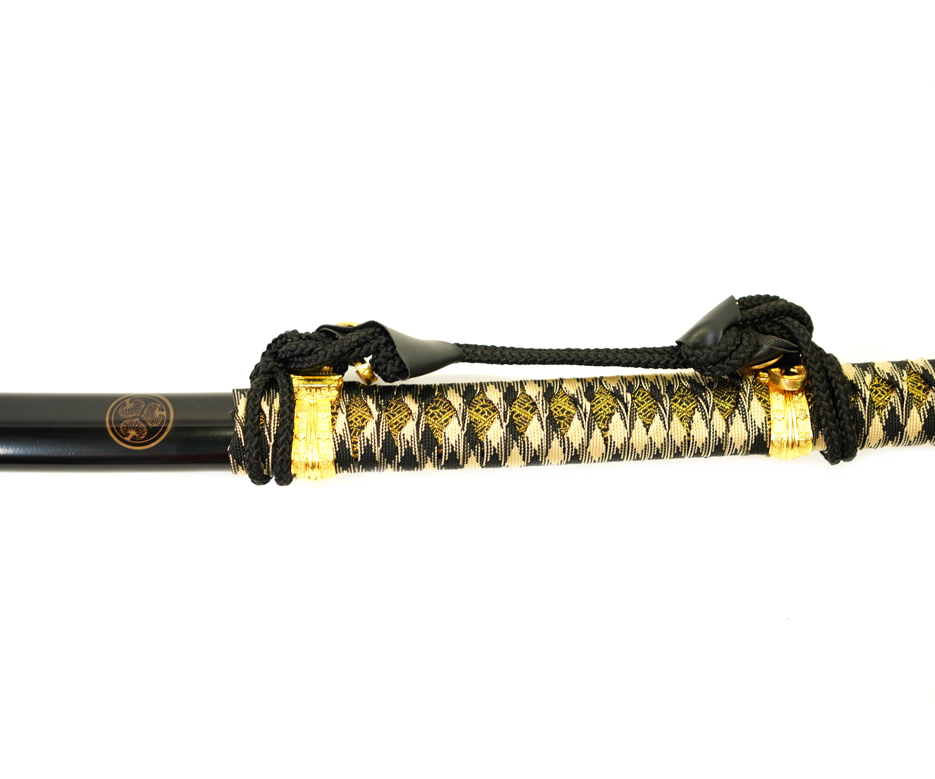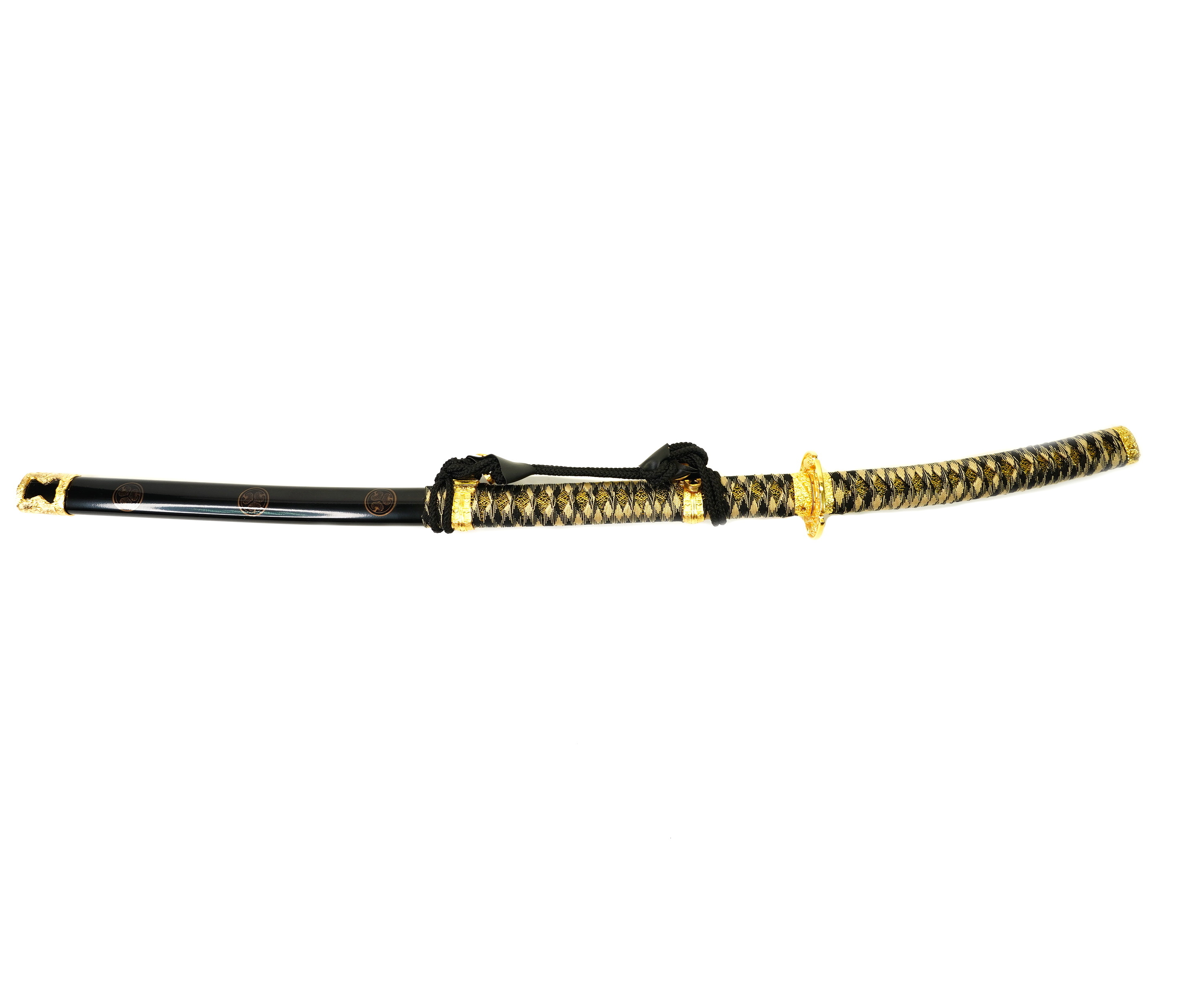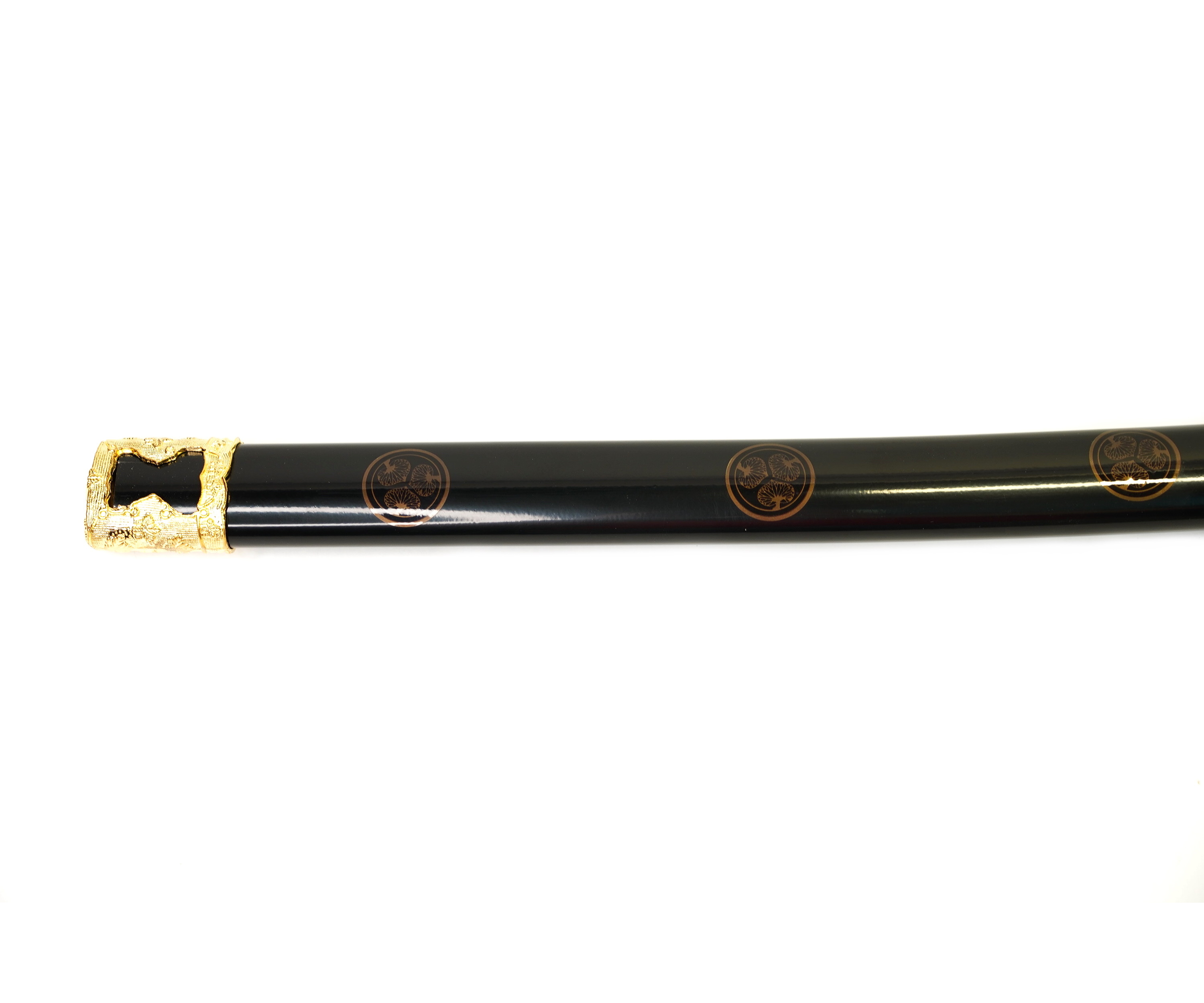 Ножны меча декорируются металлическими вставками и поясной лентой. Поверхность покрывается лакирующим составом черного цвета.