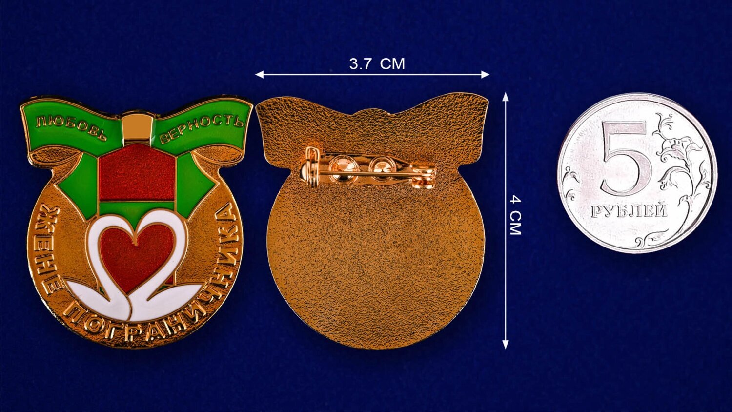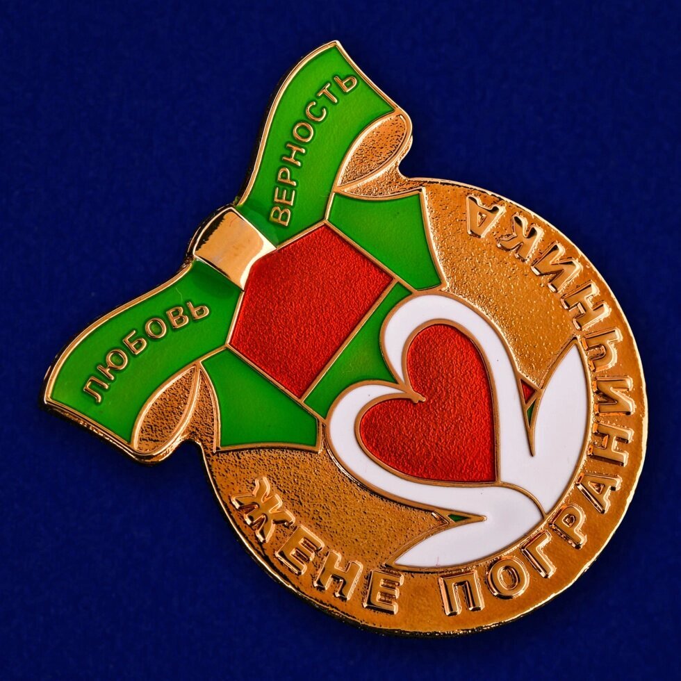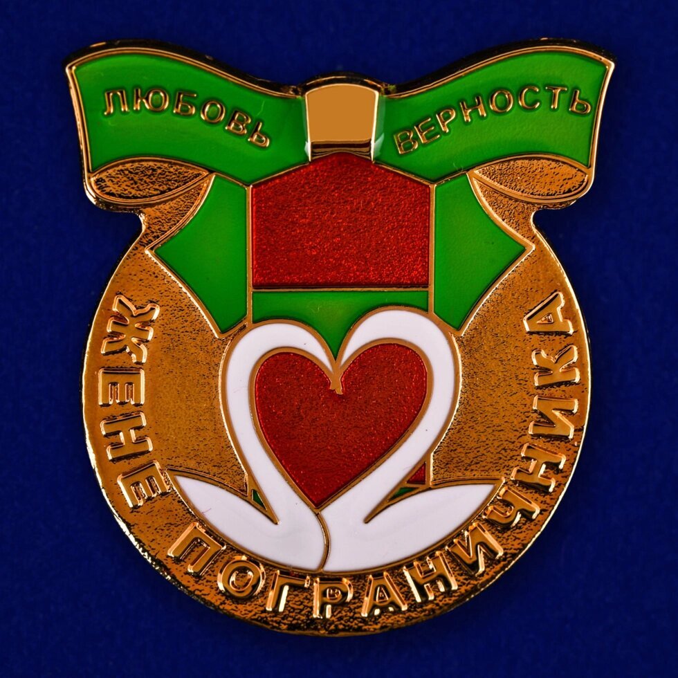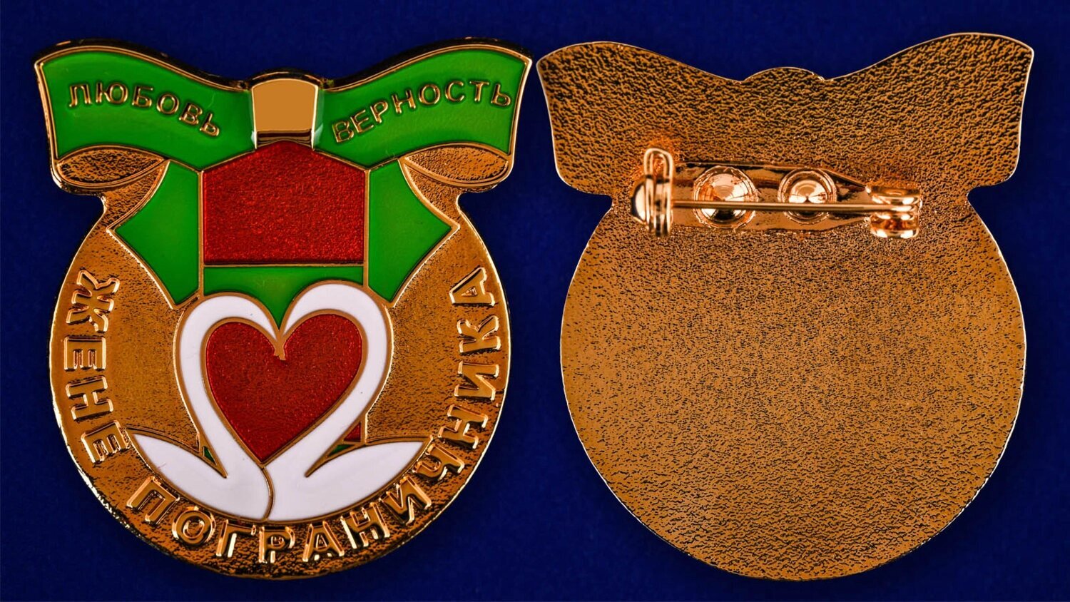 Значок для жены пограничника из латуни выполнен в форме золотистого медальона, увенчанного бантом зеленого цвета с надписью «Любовь и верность». В центре размещен пограничный столб, поверх него – изображение сердечка в обрамлении двух лебедей, под изображением – надпись «жене пограничника».