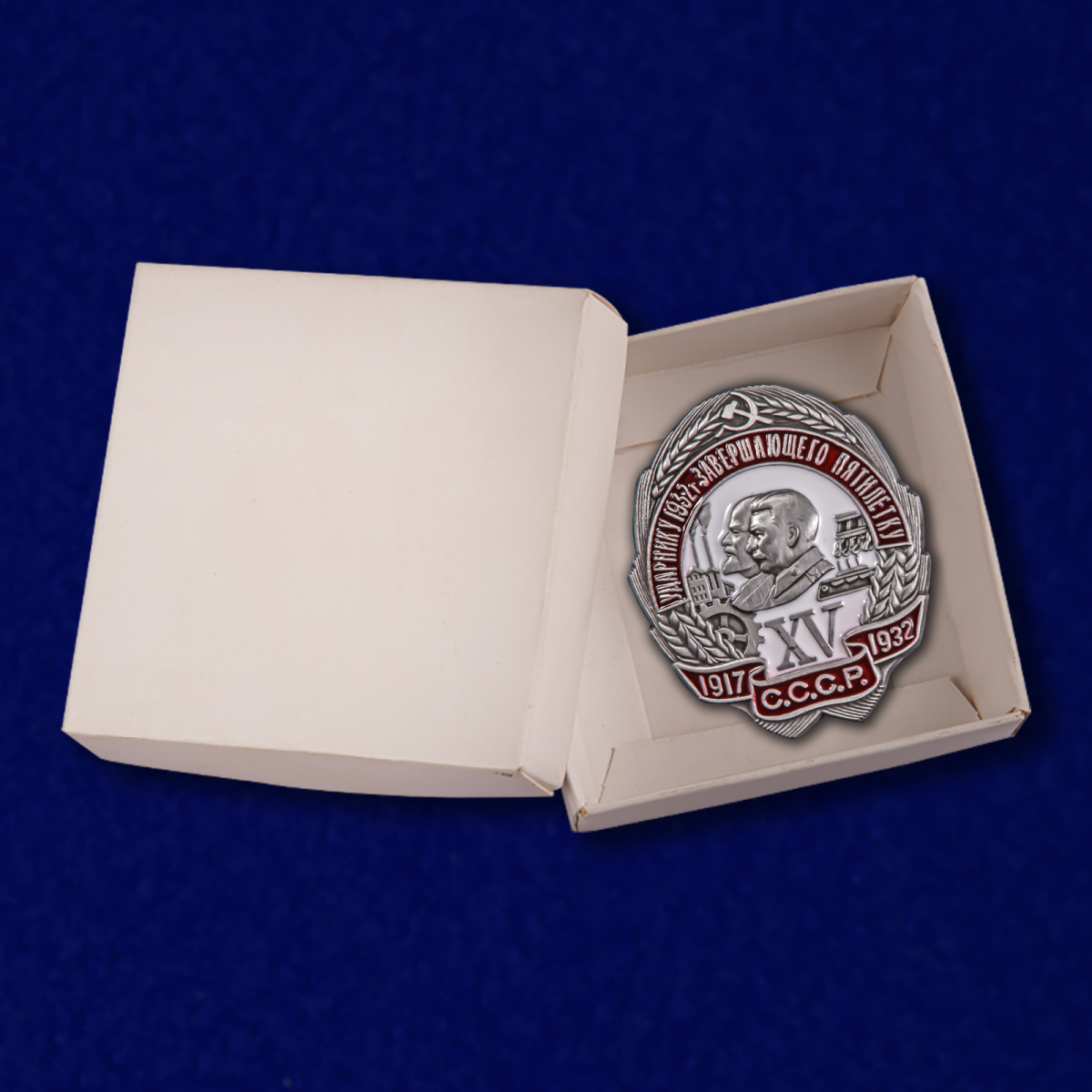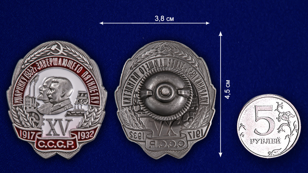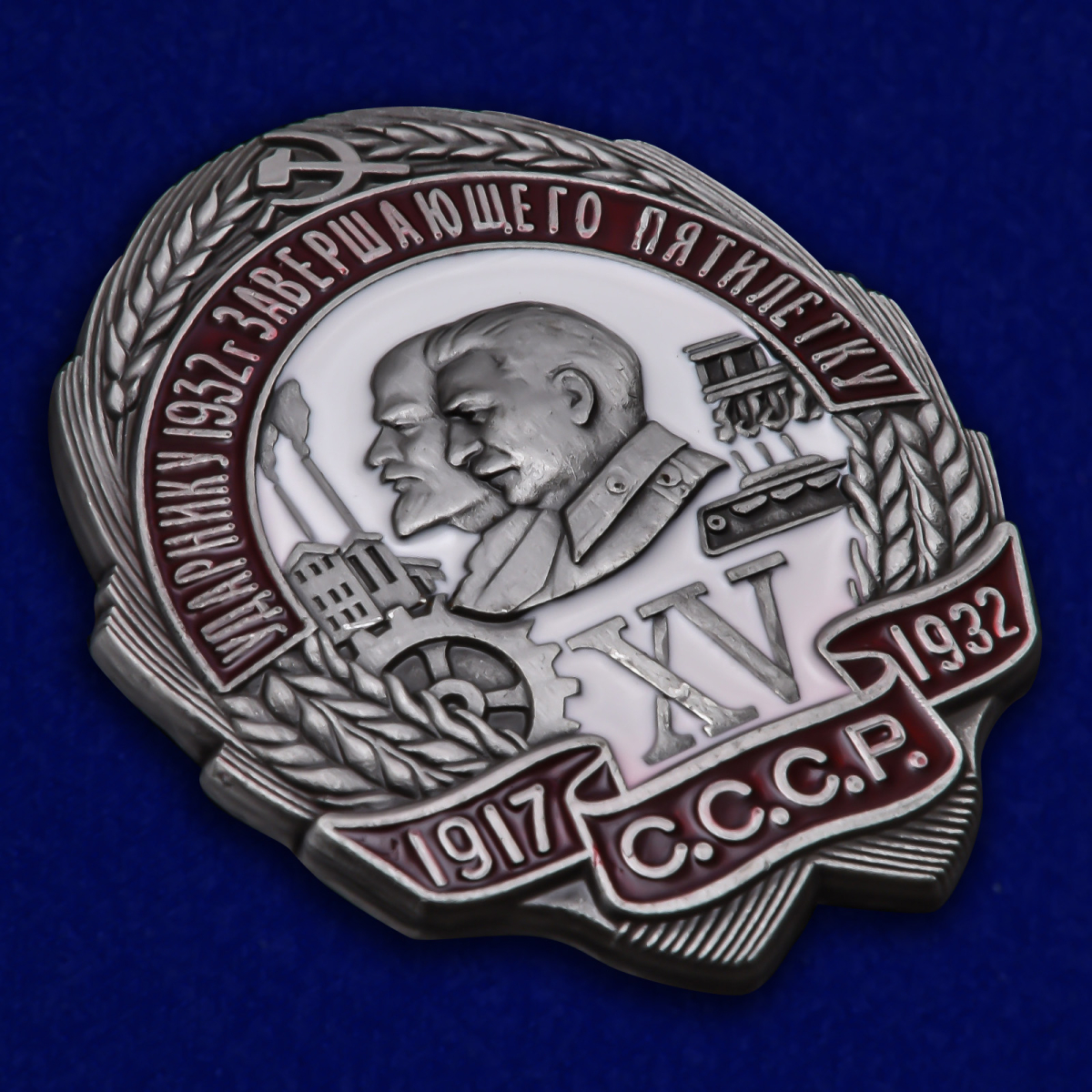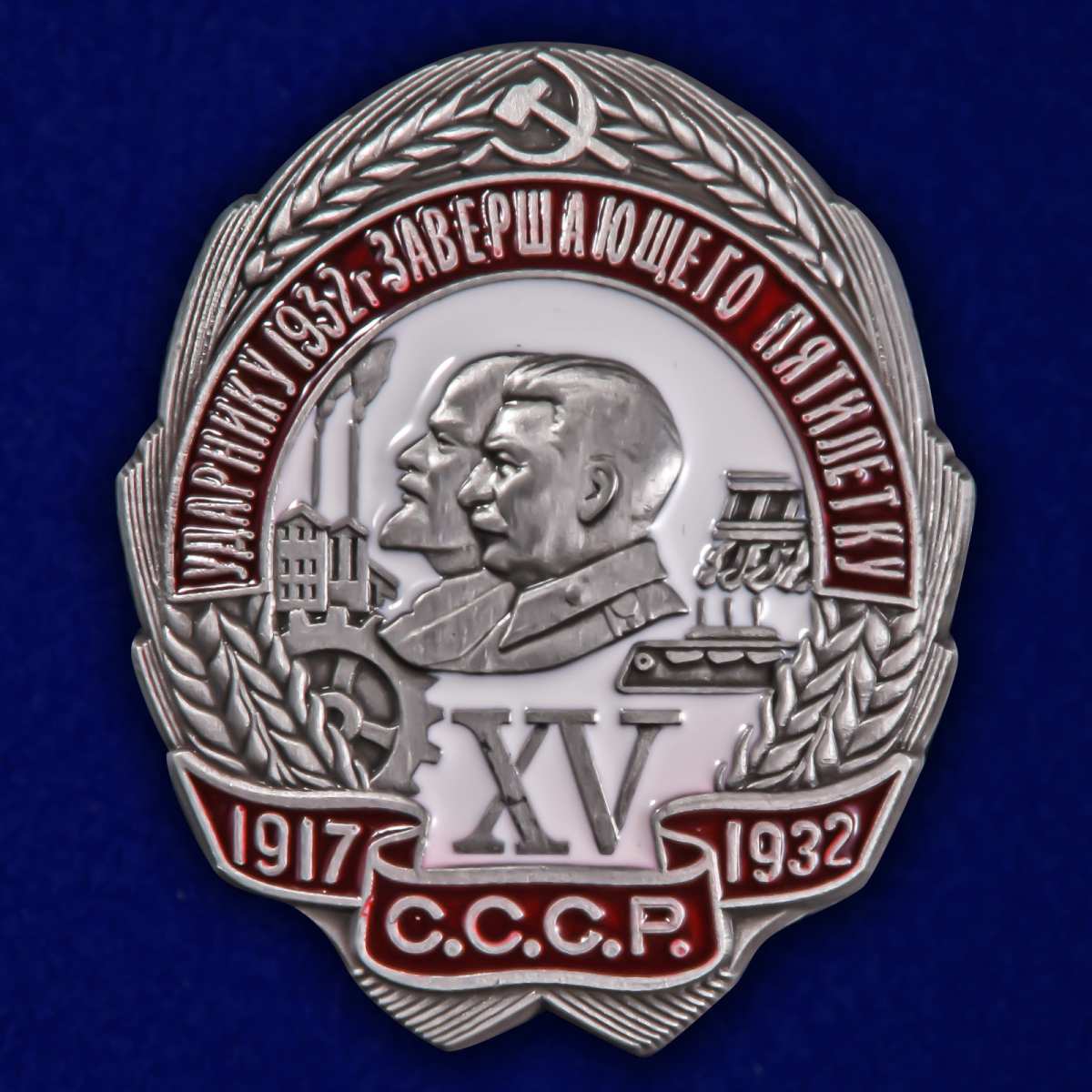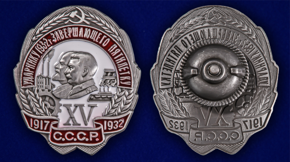 На знаке изображены портреты Сталина и Ленина, завод, венок пшеницы, лента с надписью: "Ударнику 32 г. завершающего пятилетку" и “1917 СССР 1932”.
